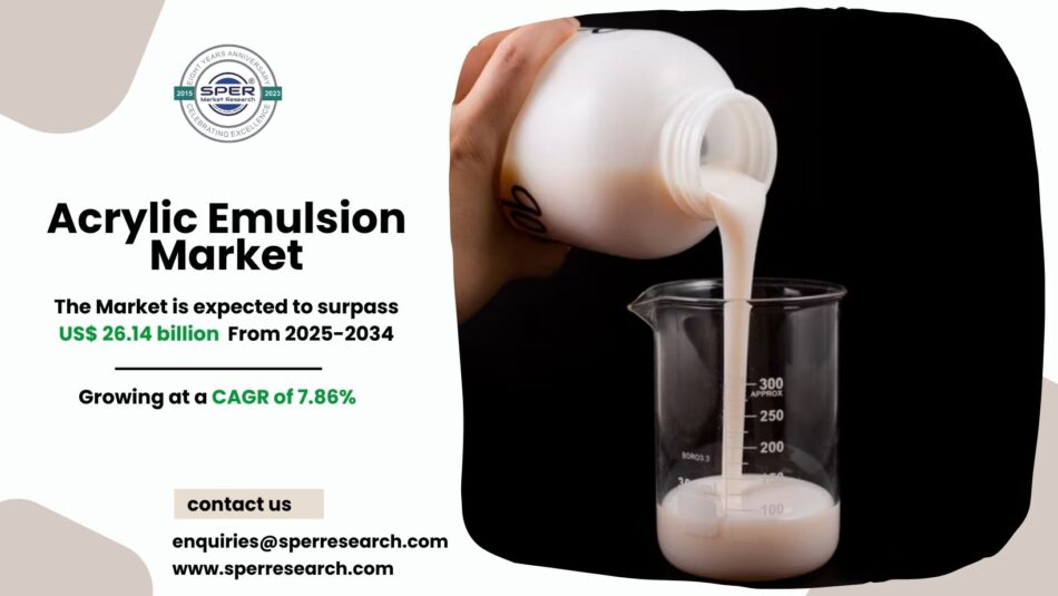 According to SPER market research, ‘Global Acrylic Emulsion Market Size- By Type, By Application – Regional Outlook, Competitive Strategies and Segment Forecast to 2034’ state that the Global Acrylic Emulsion Market is predicted to reach 26.14 billion by 2034 with a CAGR 7.86%.